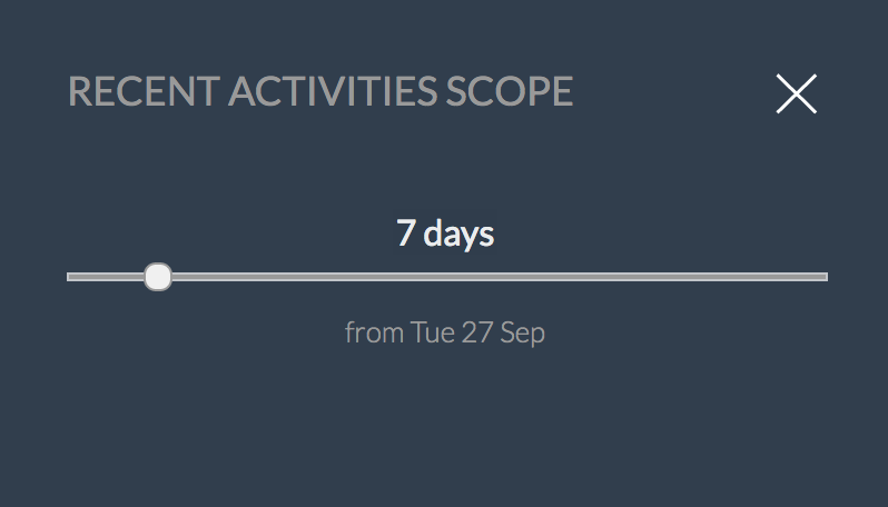 It is possible to configure the length of the period that is to be analyzed. This can be done by altering the selected Actvities Scope. The Activities Scope can be altered by either clicking on the gearwheel in the upper right corner or by clicking the change scope button. In both cases a dialog is displayed the allows the user to alter the Activities Scope.